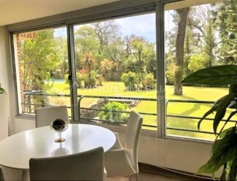 VISION alquila distinguido apartamento en Carrasco Sur, ubicado en calle residencial de poca circulación. Edificio hermoso y de nivel, construido inmerso en un parque arbolado de 3.600 m2 con piscina de uso común y rodeado de verde.